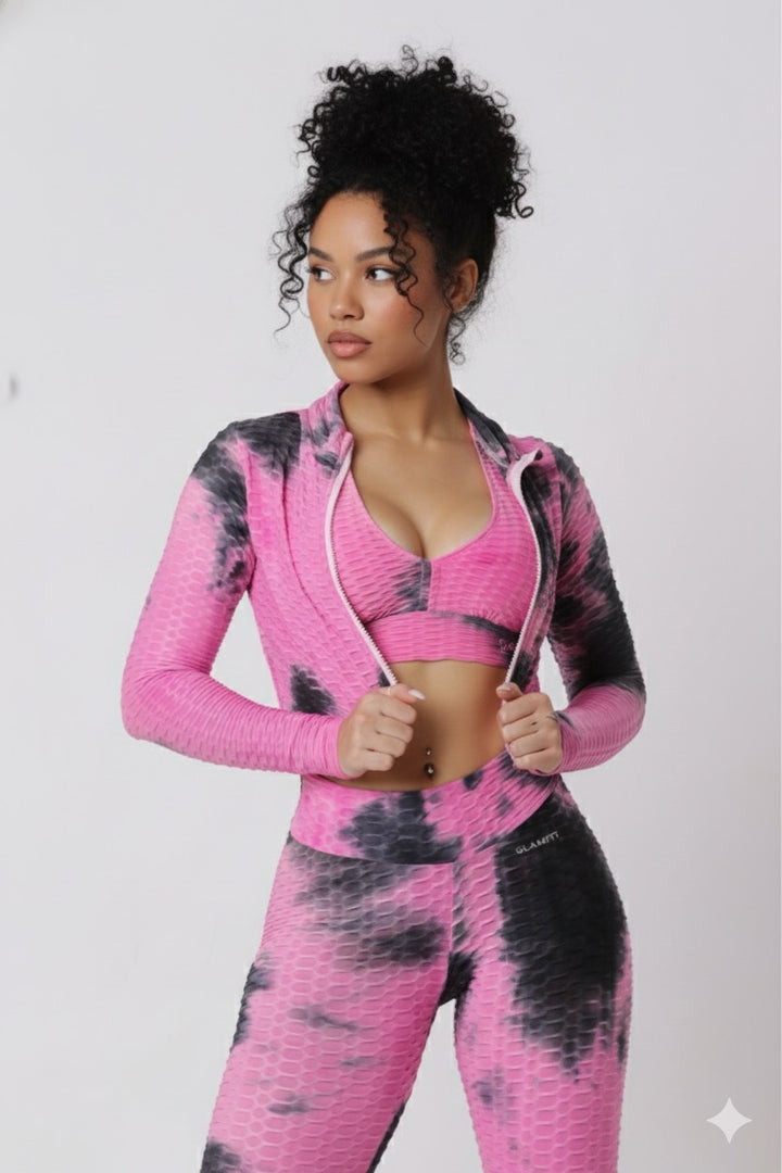 Women Soft Compression Seamless Tie Dye High Waist Leggings Bra and Jacket Set Pink & Black
